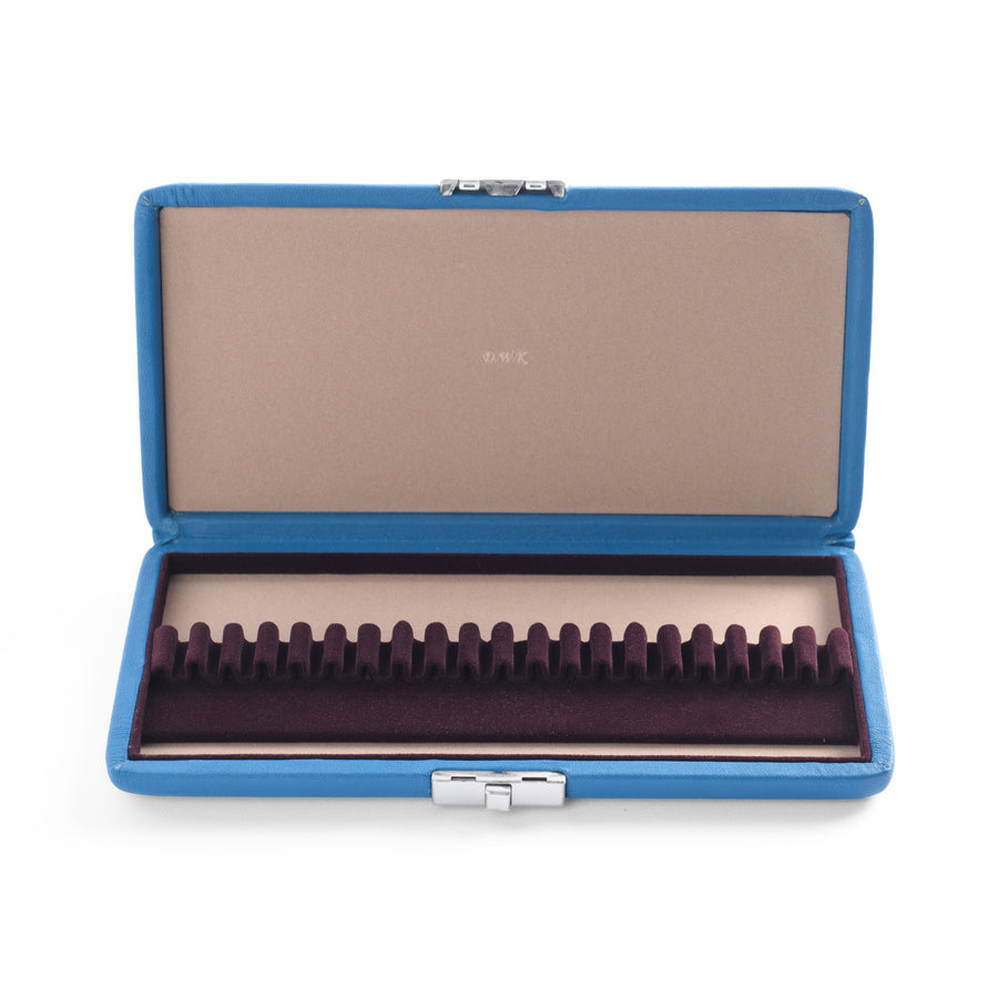 This colorful leather reed case by DWK has a tan interior with a merlot velvet insert and holds 20 oboe reeds.