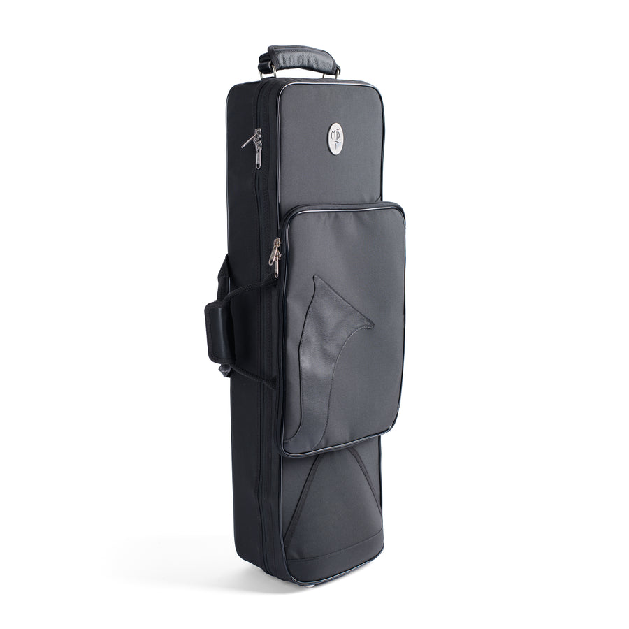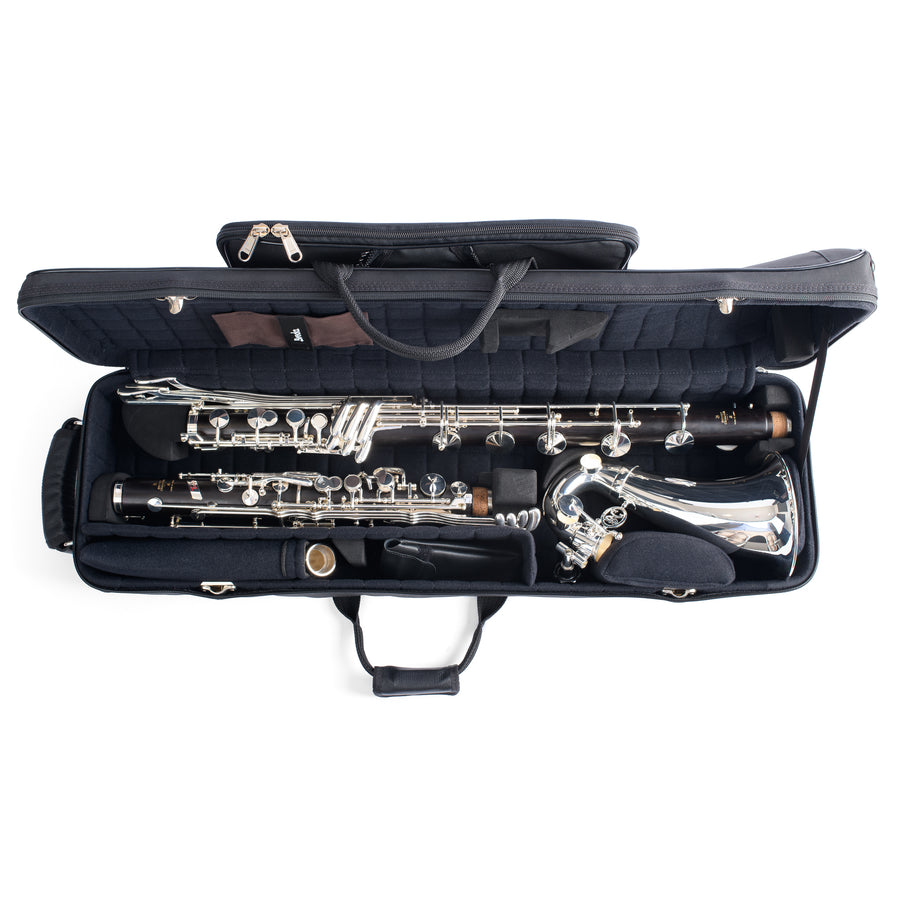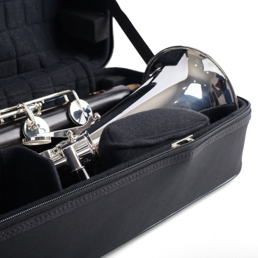 These lightweight clarinet cases feature a fiberglass hard shell exterior covered in black nylon with a removable pocket for music and accessories. The clarinet joints are "suspended" by the tenons to avoid as much keywork contact with the case as possible. Includes removable backpack straps, a neck pouch, a mouthpiece pouch, and a removable exterior front pocket.